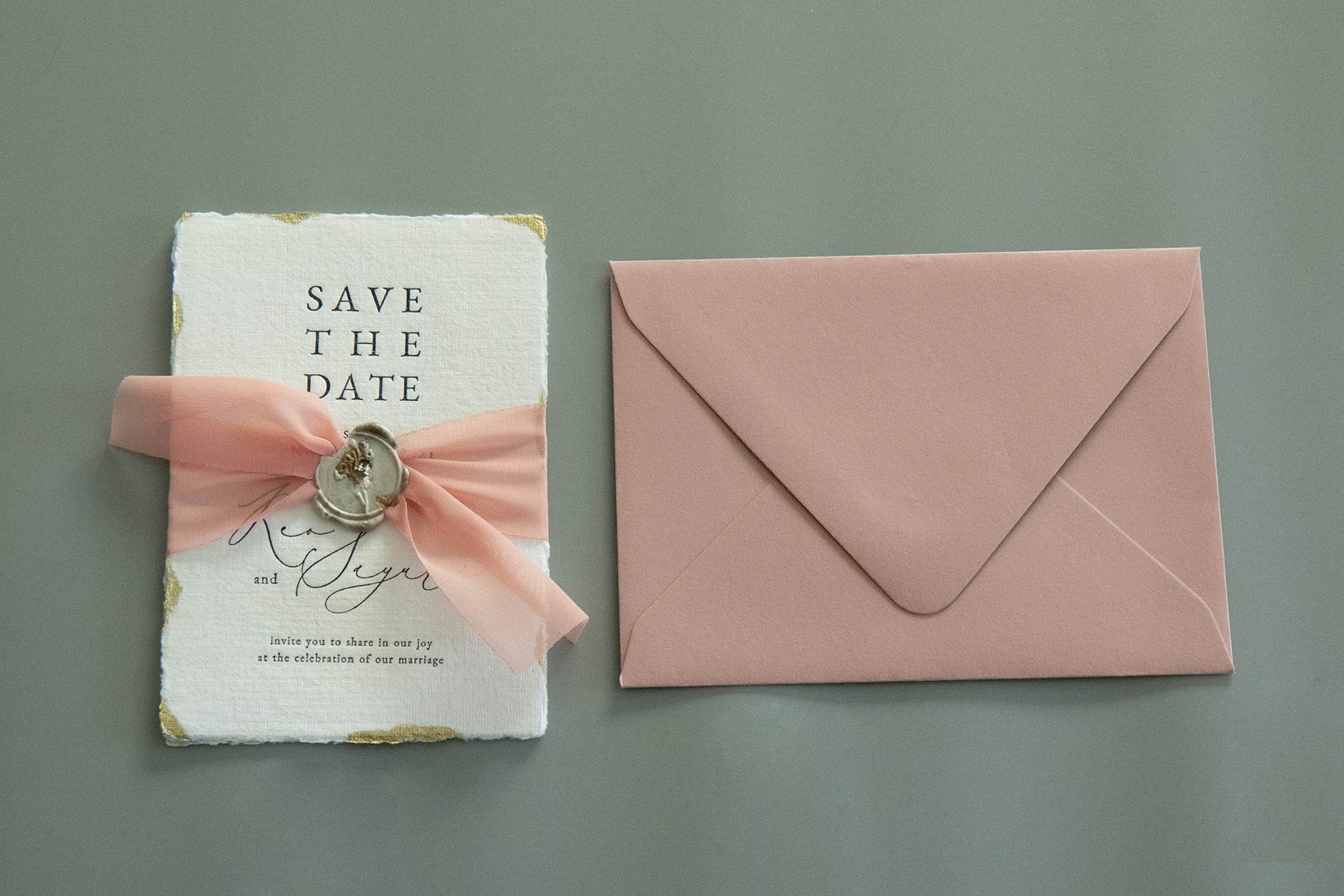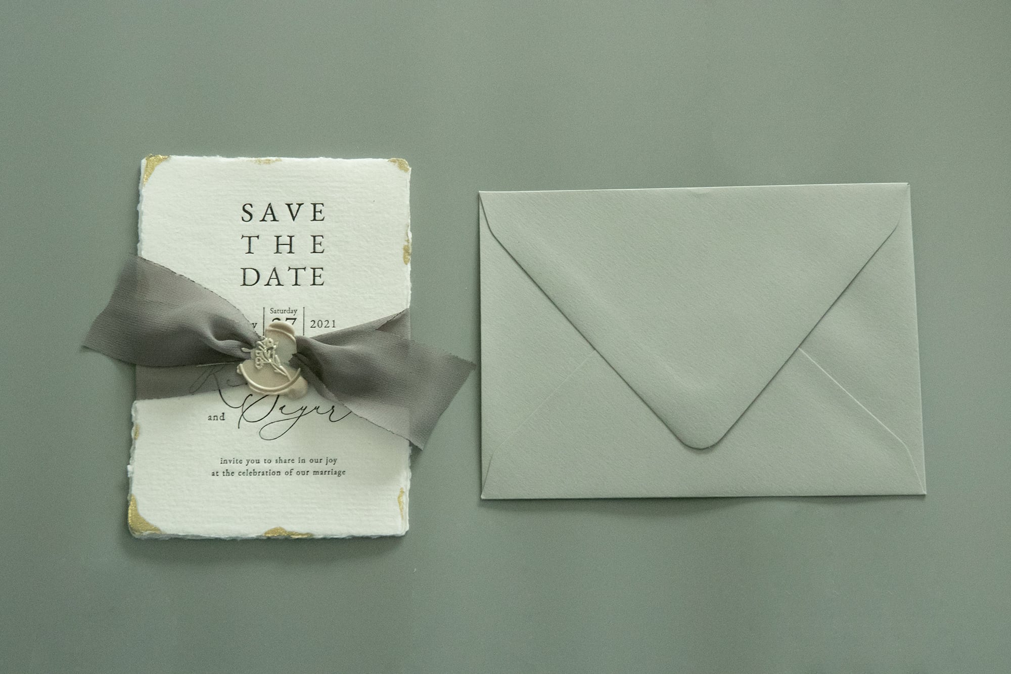 エッジには手仕事でゴールドのペイントを施し、案内状・返信用ハガキと一緒に、シーリングスタンプで留めたシフォンリボンでまとめました。